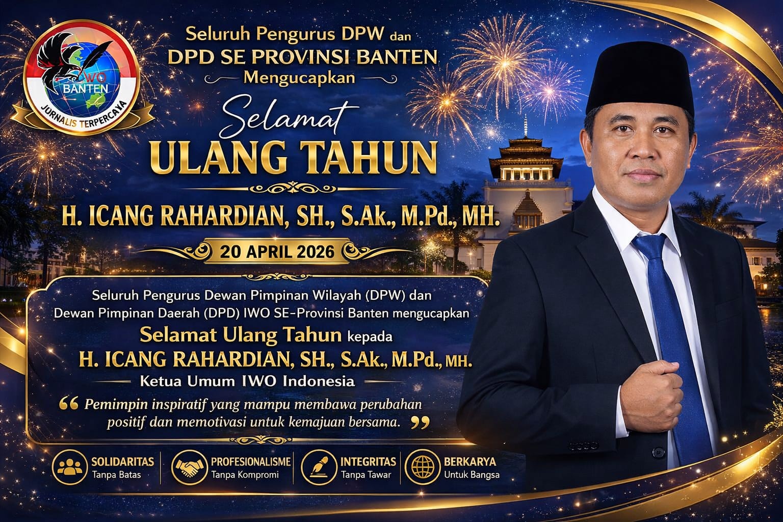 Serang [Banten] botvkalimayanews.com||Seluruh jajaran Dewan Pimpinan Wilayah (DPW) dan Dewan Pimpinan Daerah (DPD) Ikatan Wartawan Online Indonesia (IWO-I) se-Provinsi Banten secara serentak menyampaikan ucapan selamat ulang tahun kepada Ketua Umum Ikatan Wartwan Online Indonesia (IWO-I) H. Icang Rahardian, SH., S.Ak., M.Pd., MH.