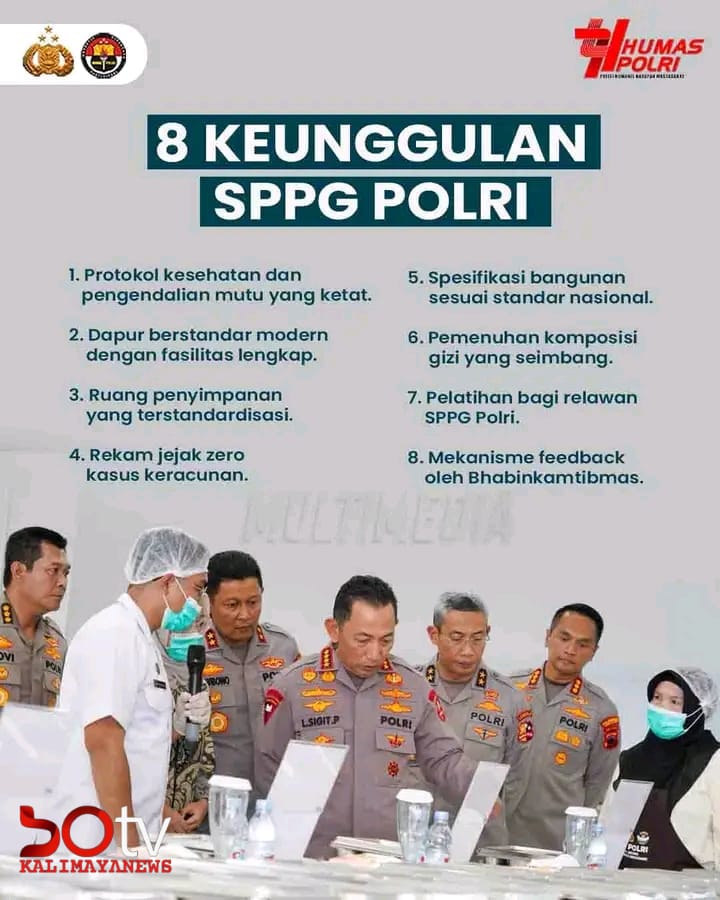 Polri di bawah komando Kapolri Jenderal Polisi Drs. Listyo Sigit Prabowo, M.Si., memastikan makanan dan minuman yang diproduksi SPPG Polri dalam kondisi baik melalui adanya uji laboratorium oleh tim Kedokteran dan Kesehatan (Dokkes) Polri.