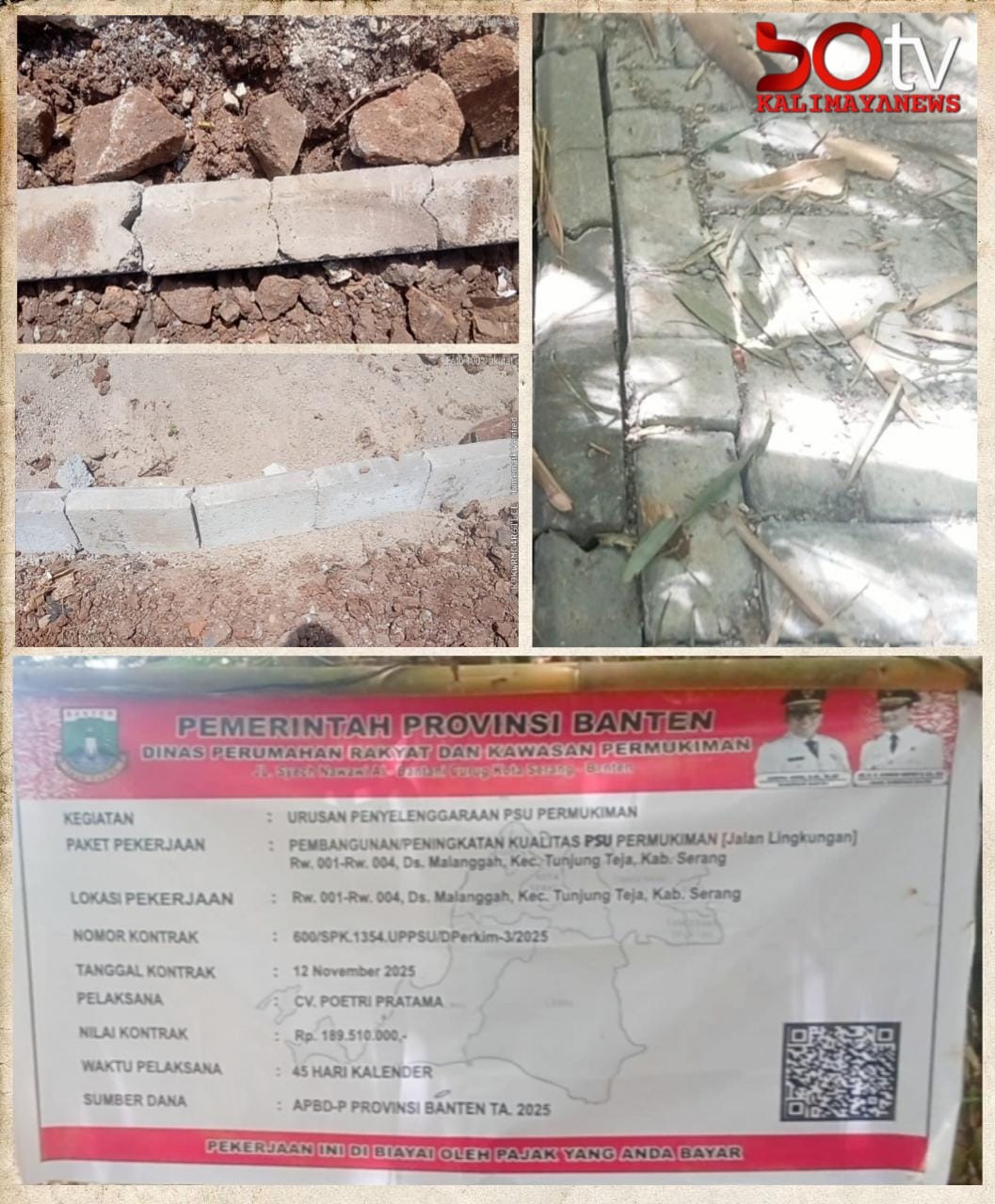 Pantauan awak media di lokasi, proyek Paving Block dengan nilai kontrak Rp. 189.510.000, yang dibiayai APBD Provinsi Banten Tahun 2025 melalui Dinas Perumahan Rakyat dan Kawasan Permukiman (DPRKP) Provinsi Banten, yangdikerjakan oleh CV. Poetri Pratama diduga kuat pekerjakan tersebut dikerjaan asal-asalan dan tanpa ada pengawasan dari pihak dinas terkait.